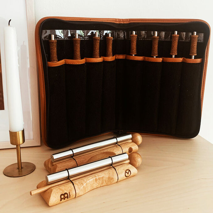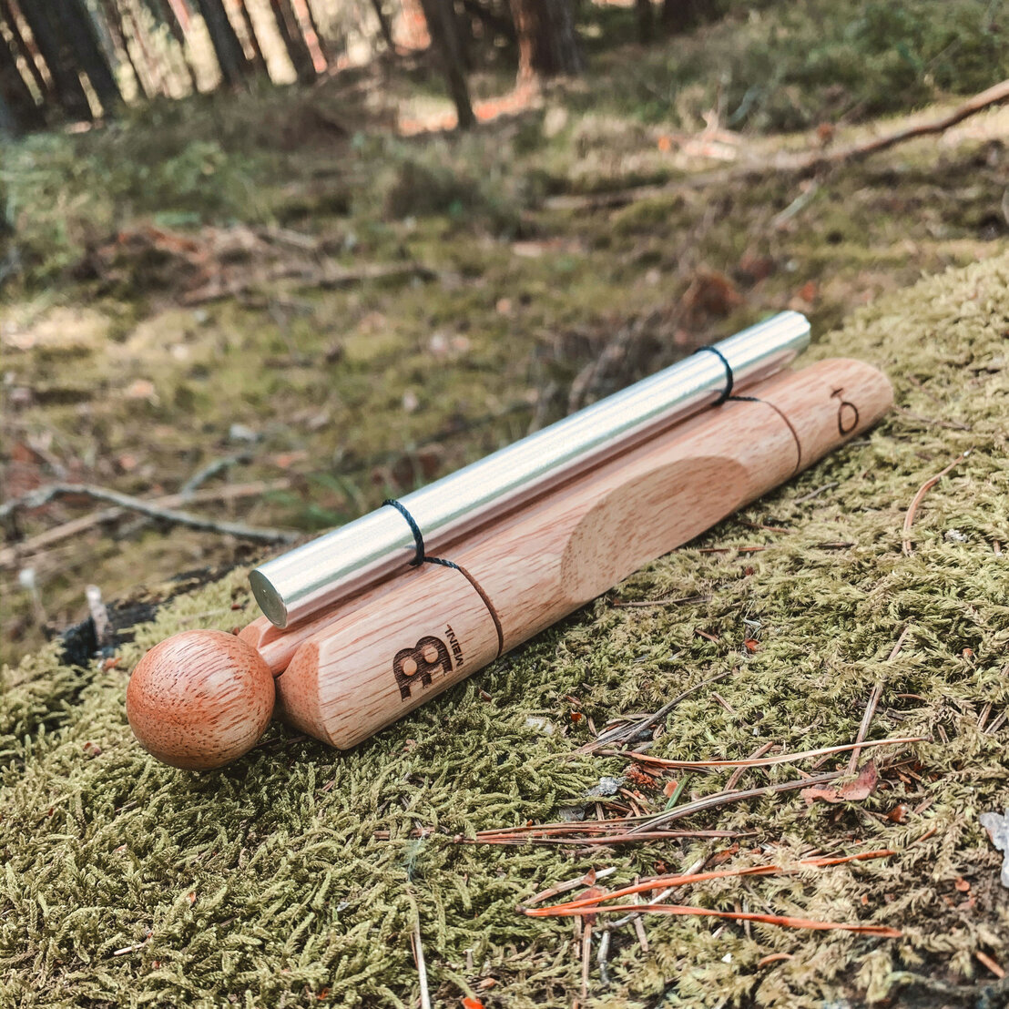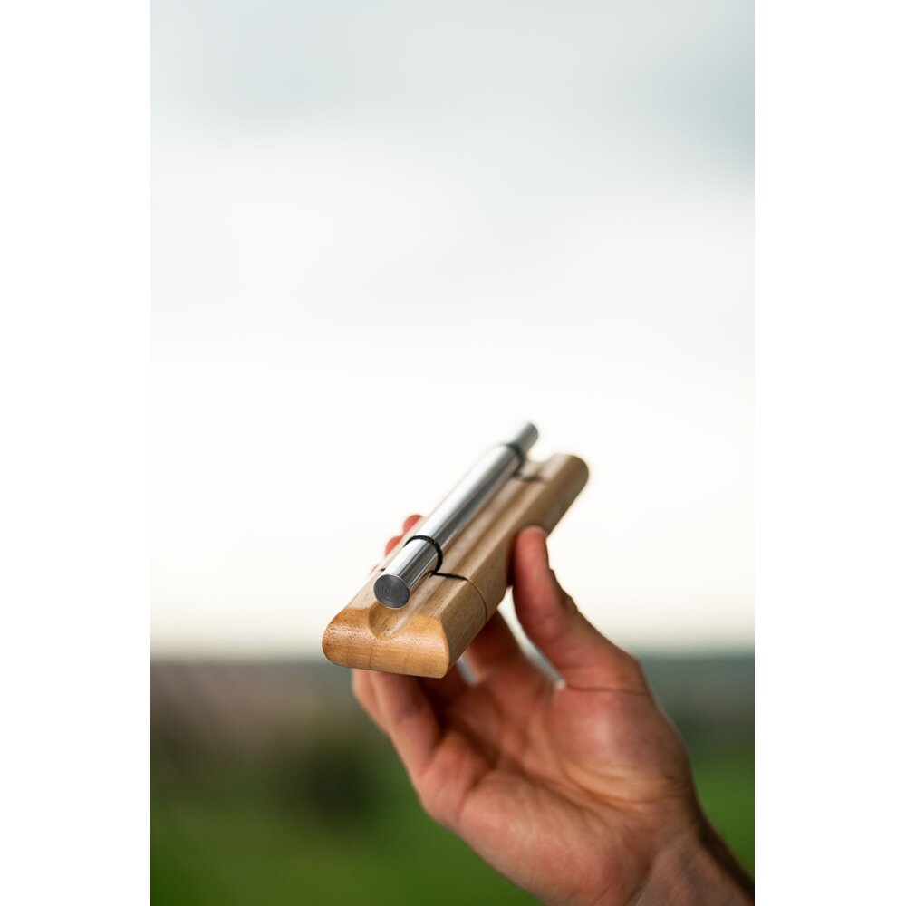 Energy Chimes are a single sound bar made of aluminum, mounted floating on a wooden base which is struck with a small mallet (usually made of wood). The sound of the Energy Chime is bright and characterized by a pronounced, long sustain.
