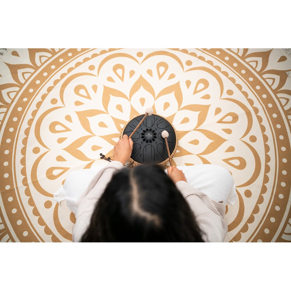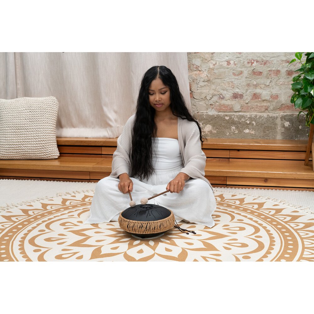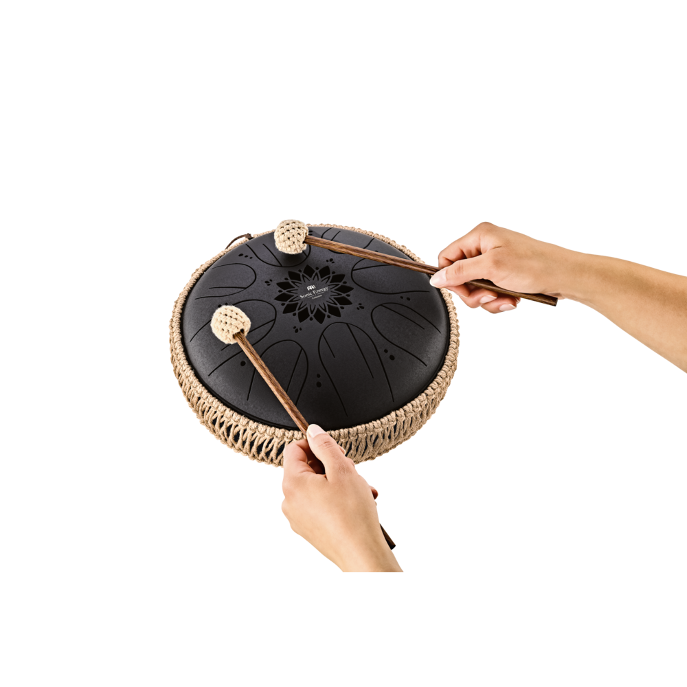 The Meinl Sonic Energy 10" Medium Octave Steel Tongue Drum is made of high-quality stainless steel. Its eight octavated notes deliver the tones in two octaves. This creates a wonderful, meditative sound similar to the tone of a handpan. A sound hole located at the bottom of the drum can be sealed with a silicon plug to provide an even more compact sound. Three silicone feet at the bottom keep the drum from slipping. The Medium Octave Steel Tongue Drum can be played with your fingers or mallets. To begin playing, simply place it on a flat surface or your lap. The drum comes with two wooden mallets with soft-wrapped rubber heads, and a nice carrying bag with zipper and handle.