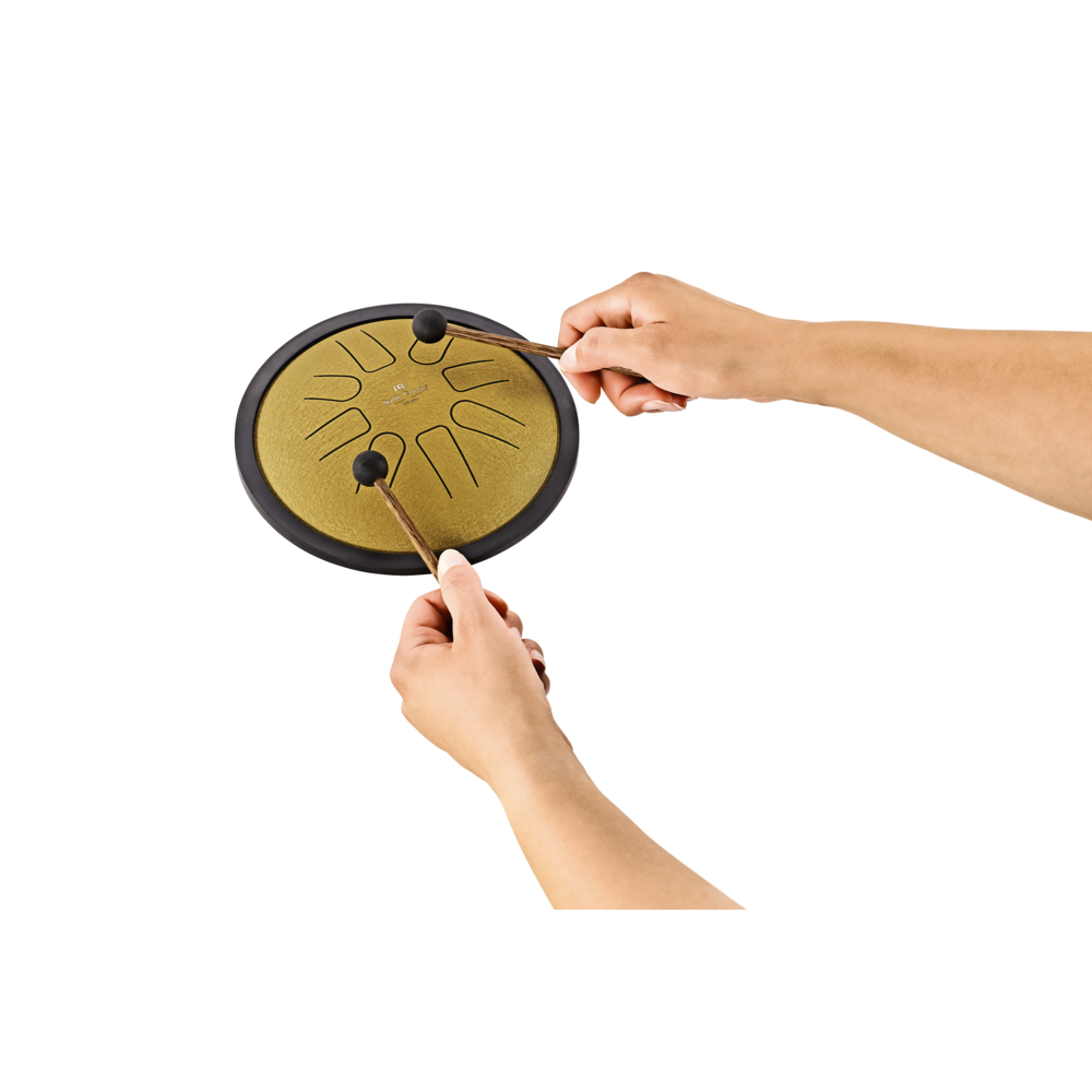 The 7" diameter drum may be played by anyone, anywhere, regardless of skill. Its pre-tuned scale means there are no wrong notes, and the sound is ethereal and soothing (like a soft steel pan drum).