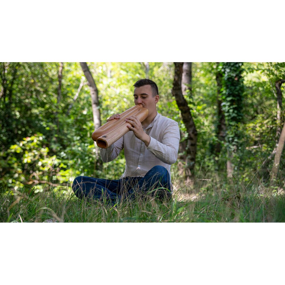 The Didgeridoo is mainly played while sitting or kneeling, with the end of the instrument resting on the floor. As a beginner, you will probably only get an unusual humming sound out of the Didgeridoo. However, the Didgeridoo can produce much more than that. Experienced players succeed in producing versatile sounds, rhythms and compositions with the Didgeridoo through the interplay of mouth and throat movements, voice effects as well as a special breathing technique.