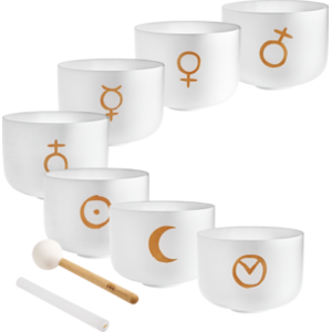 The white-frosted Meinl Sonic Energy Planetary Tuned Crystal Singing Bowls are made using the calculations of Hans Cousto (The Cosmic Octave) to match the frequencies of the sun, moon, and planets. Each one is tuned to produce the corresponding frequency of the celestial body. These white-frosted singing bowls made of high-purity quartz create a very pleasant aura with their sound and design. Their long-lasting, spherical tone spreads when the singing bowl is gently tapped or rubbed so that the energy can be felt in the entire surrounding. All Crystal Singing Bowls are delivered with a silicone ring to avoid possible impact and to ensure the best resonance. In this 7-piece Chakra set, there is also one large rod (CSBRL), and one mallet (CSBM) included, which allow you to start playing right away. You can use crystal singing bowls for a variety of purposes: Chakra healing, meditation, sound therapy, yoga, improving your home Fengshui, adjusting your emotional state, or even for room decorating.